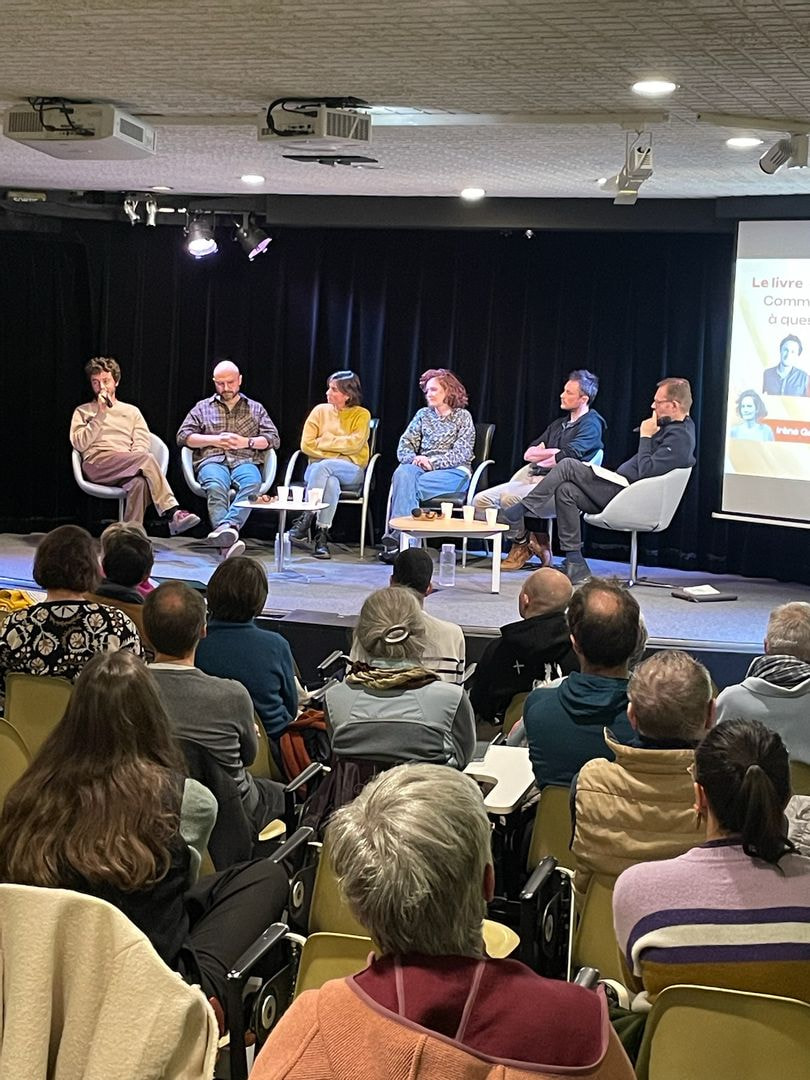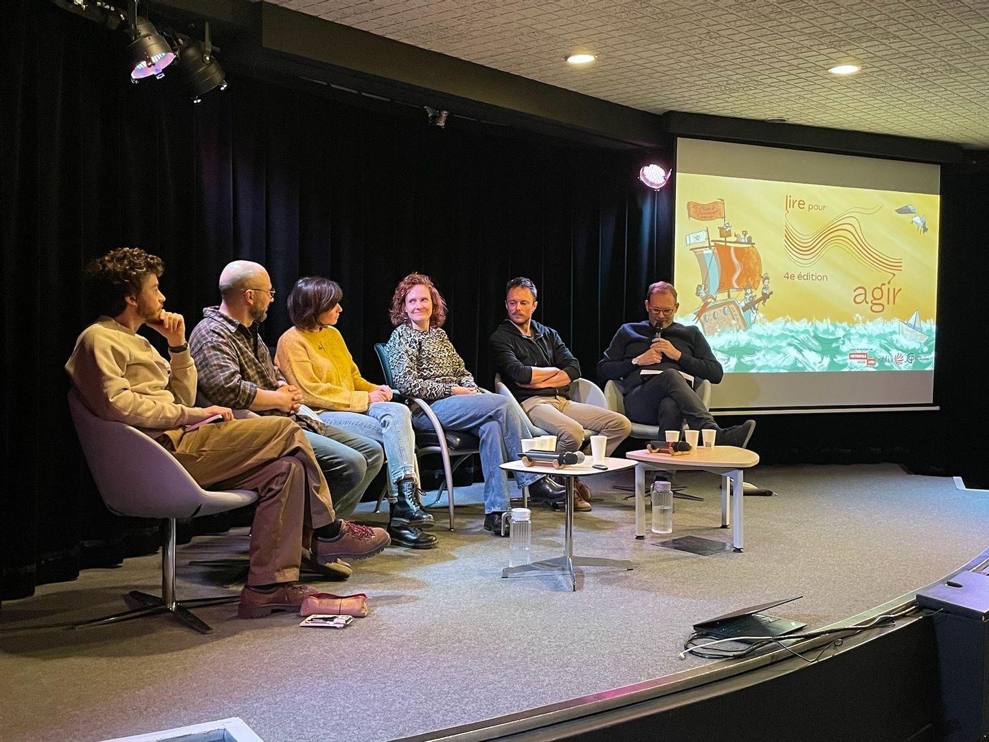 Avant de dévoiler les lauréat.es, plus de 65 participants ont assisté à une table ronde sur le thème « Le livre et la lecture comme levier pour passer à l’action », animée par le journaliste Vincent Raymond. Moment qui a réuni cinq auteurs et autrices de la sélection Adultes : Gaspard d’Allens (Des forêts en bataille), Jeremy Bismuth (Manuel de riposte écologique), Irène Gayraud (Passer l’été), Antoine Maréchal (Béton, Enquête en sables mouvants) et Lune Vuillemin (Border la Bête).